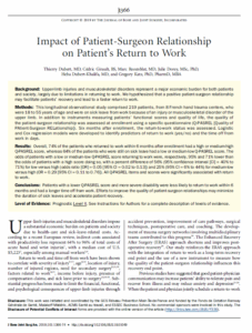 Dubert T, Girault C, Rozenblat M, Dorey J, Khalifa-Dubert H, Katz G, Impact of Patient-Surgeon Relationship on Patient’s Return to Work, Journal of Bone & Joint Surgery. 2019 (101): 1366-74.