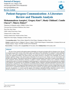 Azarpira M, Katz G, Chikhani S., Gübeli A, Guidi M, Chikhani S, Amadio P, Dubert T, Patient-Surgeon Communication: a Litterature Review and Thematic Analysis. Journal of Surgery. 2023 (8): 1925.